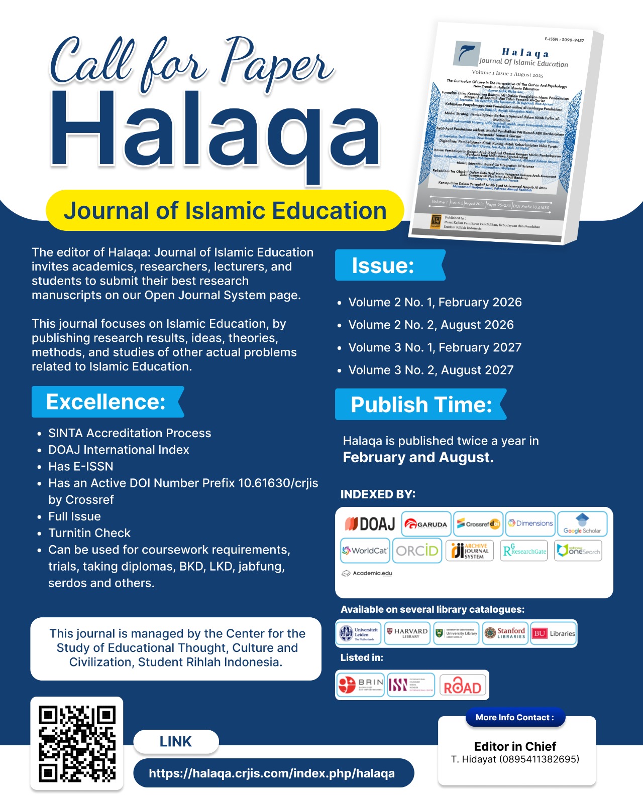 Halaqa: Journal of Islamic Education (E-ISSN 3090-9457) is an open journal that contains original research articles, review articles, and short communications in fields related to Islamic education and its teaching in schools/madrasah.